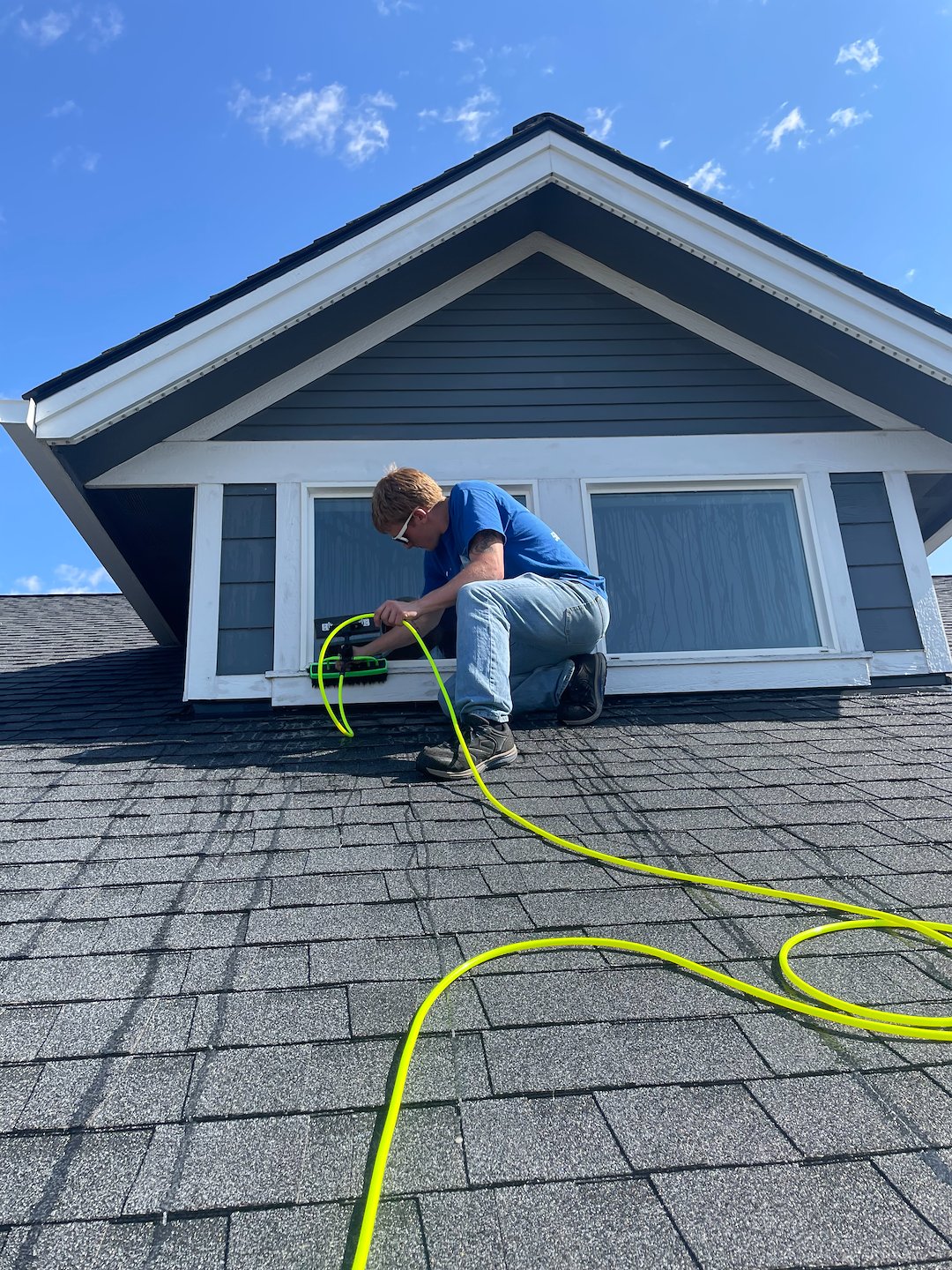 For the exterior cleaning, we used our specialized soft washing system, a safe and highly effective method for removing organic growth, dirt, and staining without risking damage to siding, trim, or paint. Unlike high-pressure washing, soft washing relies on low pressure combined with eco-friendly cleaning detergents that break down contaminants and leave surfaces looking like new. The result was a clean, streak-free exterior that made the entire home look brighter and well-maintained.