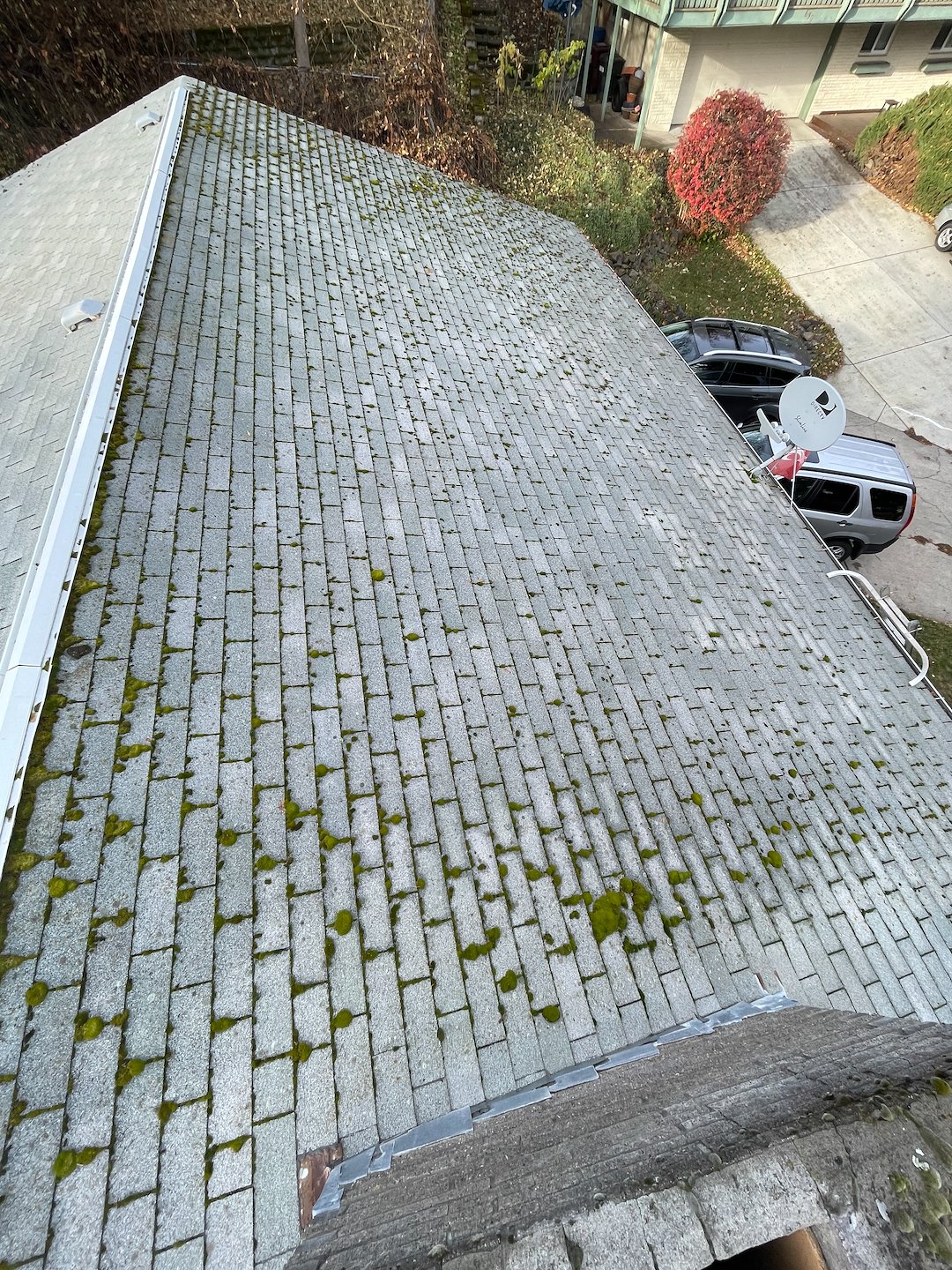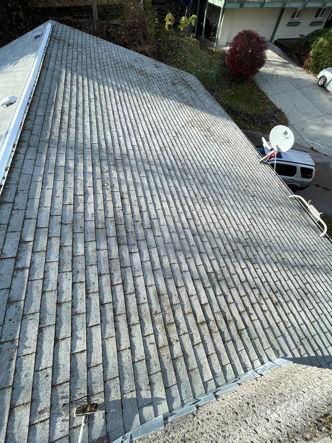 For this project, we began with our specialized roof soft washing treatment, the safest and most effective method for removing moss, algae, and organic growth. Unlike high-pressure washing, which can damage shingles, our soft wash system uses a commercial-grade, eco-friendly cleaning solution that gently kills moss at the root. As the treatment activates, the moss begins to break down and lighten in color, ensuring long-term protection without risking roof integrity. Soft washing is especially important in Pullman’s damp climate, where moss can quickly spread and cause costly roof deterioration if left untreated.