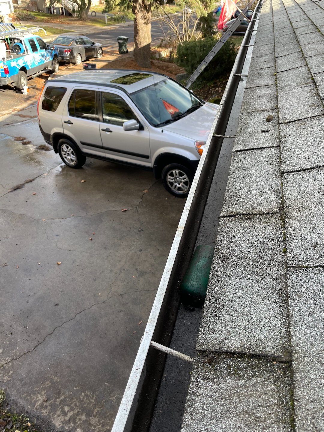 After completing the roof treatment, our team moved on to gutter cleaning, a critical service before winter storms hit the Palouse region. The homeowner’s gutters were packed with leaves, pine needles, and dirt—common seasonal buildup that can cause overflows and ice dams when temperatures drop. We thoroughly cleared all debris and flushed the gutter and downspout systems to ensure proper water flow throughout the winter months.